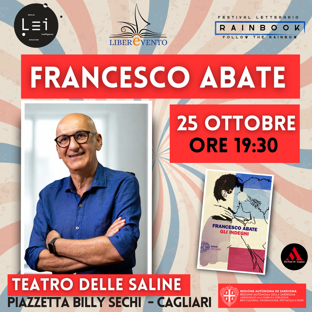 Sabato 25 ottobre alle ore 19:30, l’amatissimo giornalista e scrittore Francesco Abate presenterà il suo ultimo libro edito Einaudi dal titolo “Gli indegni” al Teatro delle Saline di Cagliari. Il libro narra la storia d’amore di due anime ribelli che si rincorrono attraverso gli irriverenti, adrenalinici, dolorosi anni Ottanta. Travolgente e malinconico, racconta l’ansia struggente di vita che lacera ogni giovinezza.